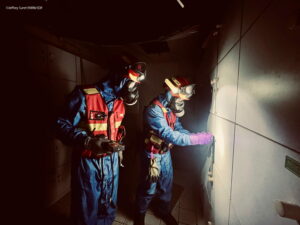 The POLYCOMBI® suit developed by OUVRY is an air-permeable garment based on the use of a filtering medium made of activated carbon microbeads. Unlike sealed suits or fully encapsulating outfits, it allows heat and perspiration to dissipate quickly, offering improved wearer comfort. It provides protection against type 5-B radioactive particles. The POLYCOMBI® is used by the FARN.