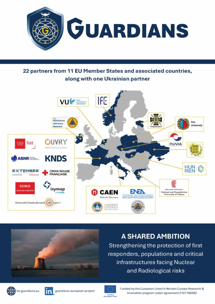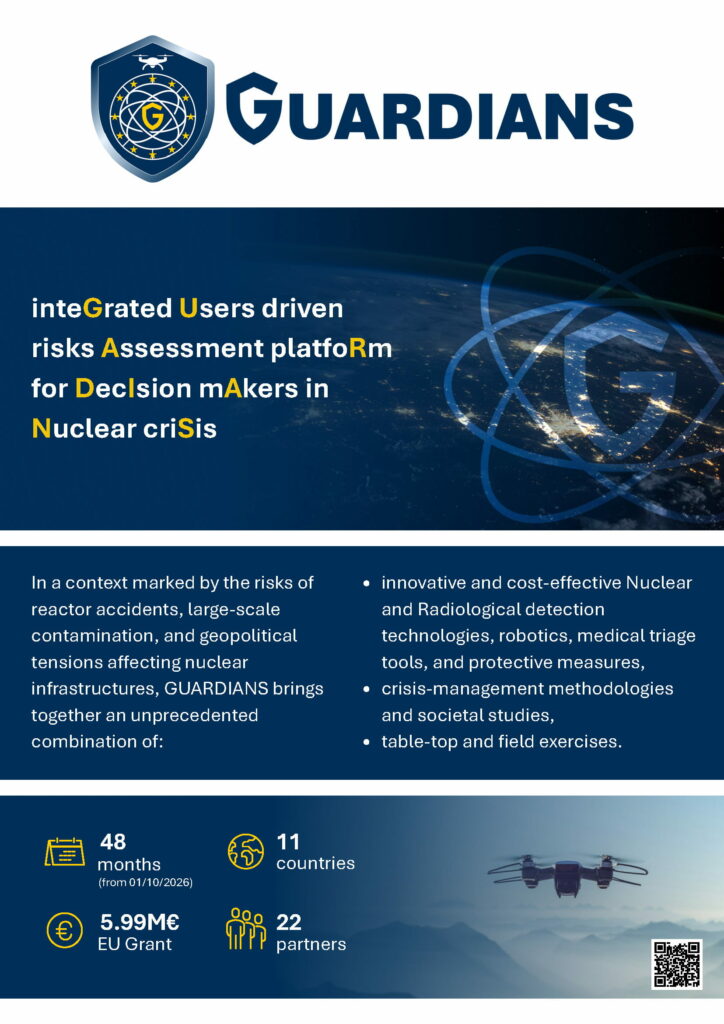 Le projet GUARDIANS (Convention de subvention n° 101225744, budget global, 1er octobre 2025 – 30 septembre 2029) a pour objectif principal d’améliorer la prise de décision et la gestion des crises nucléaires et radiologiques à l’échelle européenne.